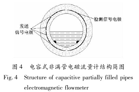 ②電容式非滿管軟化水流量計(jì)h。電容式非滿管軟化水流量計(jì)結(jié)構(gòu)簡(jiǎn)圖如圖4所示。、檢測(cè)信號(hào)電* 發(fā)送信號(hào)電