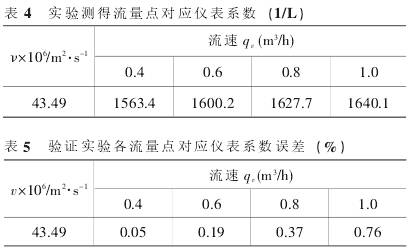 實(shí)驗(yàn)中每個(gè)流量點(diǎn)均進(jìn)行3次測(cè)量,(j=1,2,3),3次測(cè)量的平均儀表系數(shù)作為此流量點(diǎn)的儀表系數(shù)Ki(i=1,2,3,4,5),各流量點(diǎn)儀表系數(shù)*小值與*大值的平均值,作為傳感器的儀表系數(shù)。