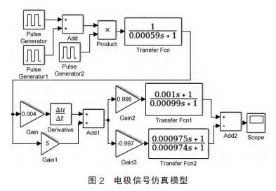 本文基于 Matlab 中 Siumlink 對電*信號進行仿真,勵磁方式為三值波勵磁,勵磁頻率 f=25Hz,傳感器參數 D=40mm、Rx=88.8Ω、Lx=162mH,勵磁系統參數 Ue=100V、穩態電流 I0=200mA。基于電*測量回路搭建的仿真模型如圖 2 所示,圖中信號模塊 pulsGenerator 通過加法器、乘法器得到勵磁電流。由公式(1),在固定流速下感應電勢與勵磁電流成正比,通過增加 Gain1 模塊得到感應電勢信號。 對勵磁電流進行求導即經模塊 Derivative 得到微分噪聲, 其中 Gain 值與 Lx 和 L1 相關。 感應電勢與噪聲經Add1 疊加之后得到電*信號 E1(t)。 scope 觀察輸出信號波形。仿真波形和真實波形如圖 3 所示。 將傳感器參數代入到勵磁電流穩態調節時間公式中,得電流上升時間為 360μs,測得實際上升時間為 390μs,兩者相差不大,驗證了仿真模型的正確性。