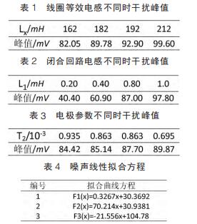 仿真試驗中,設定線圈等效電感取值范圍為 162~212mH,間隔 10mH;閉合回路等效電感范圍 0.2~1mH,間隔為 0.2mH;雙電層電容、接觸電阻隨流體電導率變化而變化,電導率增大接觸電阻和雙電層電容減小而電荷傳遞電阻增大。可設定電*接觸電阻、雙電層電容和電荷傳遞電阻范圍分別為 5~15kΩ、10~20μF 和50~60Ω,由公式(7)知,可用 T2 表示上述三者關系。 仿真參數取值不同情況下,通過 MATLAB 工具箱對仿真測量得到的干擾峰值進行曲線擬合畫出相應的曲線圖。 其中仿真數據和相對應的曲線方程如表 1~表 4 所示,曲線圖如圖 4~圖 6。