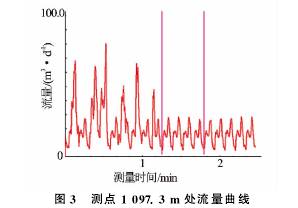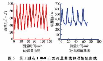 T-××-××1井是大慶油田采油五廠1口水驅產出井,采用阻抗式含水率計在該井進行了測試。圖3、圖4分別為測點深度1097.3m測量的流量及混相值曲線圖。2min的采樣時間內,流量及混相值曲線波動劇烈,明顯受井下產氣影響,進行平均值計算時只能取后半段較平穩的數據,因此,測試時需延長測量時間。錄取不同范圍數值時流量及含水率測量差值較大,流量平穩段為14.81m3/d,高值時達到23.52m3/d;取不同測量段的混相值時測量含水率*大相差12%。重復測量得到了相同的測量結果。由此可見,氣體對流量及含水率測量產生了非常大的測量誤差。