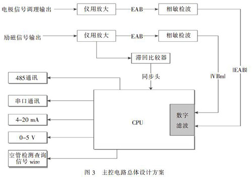 電*檢測出的微弱感應電動勢E, 先經前置放大器的放大和噪聲抑制而成為大幅度低阻抗的電壓信號。此信號經相敏檢波后,給CPU 進行數字濾波、處理和控制,通過利用雙線性變換法將模擬的二階巴特沃斯低通濾波器轉換為數字式濾波器,既簡化電路設計,且可靠性高、穩定性好。通過編寫軟件CPU 能對放大器的溫度漂移及零點漂移給予補償, 并在測量的全量程范圍內分10 段對信號進行非線性修正,使得測量值更好地擬合真實數據。空管檢測電路上,CPU 作為從控制器。當主控制電路上發出空管檢測查詢信號wire, 從控制器進行識別后接收并判斷出查詢什么信號,然后產生應答信號上傳至主控芯片輸出顯示;當檢測為空管信號時, 從CPU 發出的zero 信號通過控制MOS 管開關來關斷流速輸出。在應用中,對于微弱信號的放大及提取還需注意PCB 板設計時EMI 電磁屏蔽考慮,屏蔽來自空間磁場的干擾、周邊設備的輻射造成的干擾和板內之間的干擾,如數模分離、強弱電分離等等。