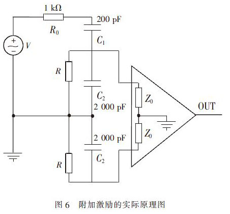 如圖6 所示為附加激勵的實際原理圖。其中R是流體電阻,C1是激勵源與傳感器電*及其放大器輸入的隔直電容,C2是信號電纜的對地電容。