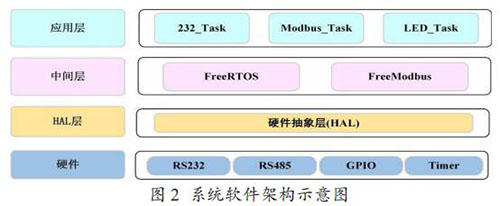 Modbus 通訊模塊的軟件架構如圖 2 所示,分為硬件層、硬件抽象層,中間層和應用層。中間層包括一個實時操作系統FreeRTOS 和一個針對嵌入式環境開發的輕量級 Modbus 協議庫Freemodbus。在應用層,主要創建了三個任務,232_Task 負責讀 取和解析流量計表頭輸出的文本信息,Modbus_Task 負責存儲 解析后的流量計數據到 Modbus 寄存器表,以及以 Modbus 協議與取水監測設備通信,LED_Task 是一個輔助任務,主要用來提示程序運行狀態。
