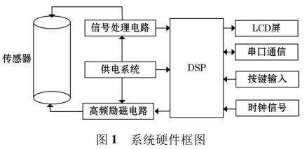 高頻勵磁管道流量計由傳感器、高頻勵磁電路、信號處理電路等組成,其中高頻勵磁電路決定著傳感器磁場的強弱,勵磁電路的穩(wěn)定性以及精確性決定著系統(tǒng)檢測的準確性以及穩(wěn)定性。DSP 系統(tǒng)控制勵磁電路激勵傳感器線圈,當線圈中有導(dǎo)電液體流過時,其切割磁感線并在傳感器兩端的線圈上產(chǎn)生感應(yīng)電動勢,利用信號檢測電路監(jiān)測感應(yīng)電動勢的大小,*后根據(jù)相應(yīng)關(guān)系計算出液體的流量,系統(tǒng)硬件框圖如圖 1 所示。
