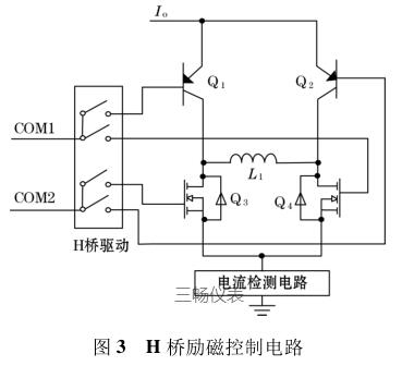 由圖 3 可知,I o 為高低壓切換恒流控制電路輸出的恒流源電流,H 橋驅(qū)動的 COM1 端控制三*管 Q 1和場效應(yīng)管 Q 4 的通斷;COM2 端控制三*管 Q 2 和場效應(yīng)管 Q 3 的通斷。L 1 表示的是勵磁線圈(傳感器中線圈),COM1、COM2 為正交的 PWM 波信號,因此在勵磁線圈 L 1 的兩端會產(chǎn)生方波勵磁信號。檢流電路主要是用來檢測勵磁線圈中電流的變化,當線圈中的勵磁電流方向變化時,可以及時將此信息反饋給高低壓切換恒流控制電路中的比較器,從而實現(xiàn)切換高低壓源達到恒流控制的目的。