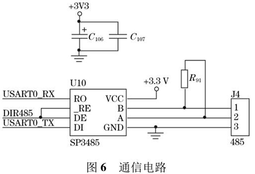 管道流量計輸出的流量值可以通過外接的 TFTLCD 屏直接顯示,還可以通過預(yù)留的 RS485 通信接口將數(shù)據(jù)發(fā)送到上位機中。RS485 電路*大的優(yōu)點是 485 電平與 TTL 電平兼容,方便與 TTL 電路相連;抗共模干擾能力強;數(shù)據(jù)傳輸速度快,高達 10 Mbps;通信距離遠,*大為 1.2 km。系統(tǒng)采用 SP3485 芯片進行數(shù)據(jù)通信,SP3485 是一款低功耗芯片且符合RS485 協(xié)議的收發(fā)器,電路圖如圖 6 所示。