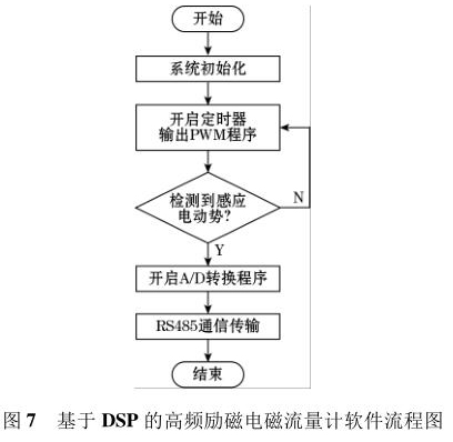 軟件流程圖如圖7 所示。軟件采用模塊化的設(shè)計方法,主要設(shè)計了勵磁控制切換程序、PWM 波產(chǎn)生程序、A/D 轉(zhuǎn)換程序以及 RS485 通信程序等。系統(tǒng)上電后*先執(zhí)行復(fù)位操作,利用 DSP 內(nèi)部的定時器產(chǎn)生PWM 波控制 H 橋電路中的勵磁方式,當系統(tǒng)檢測到傳感器線圈輸出的感應(yīng)電動勢后,利用 DSP 內(nèi)部的 12位 A/D 轉(zhuǎn)換器對此信號進行模數(shù)轉(zhuǎn)換,*后根據(jù)相應(yīng)算法計算出管道中被測液體的流量。