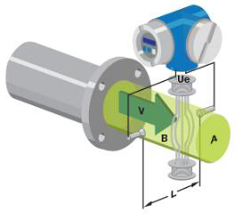基本上,當導電液體流過磁場時,會感應出電壓。為了測量該產生的電壓(與流動的液體的速度成正比),使用了兩個彼此相對安裝的不銹鋼電*。