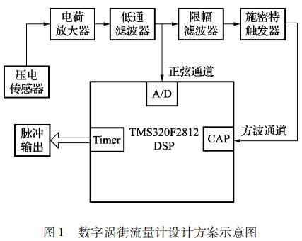 本文設計的基于 TMS320F2812 DSP 的數字煙氣流量計的信號處理系統由前置放大電路和數字信號處理電路兩部分組成。本文選用的前置放大電路即為目前被廣泛應用的普通煙氣流量計的前置放大電路,主要由電荷放大電路、低通濾波電路、限幅濾波電路和施密特觸發電路組成; 對于經壓電傳感器測得的渦街信號采用了頻域分析和時域分析相結合的方式,即由前置放大電路和數字信號處理電路相配合。時域分析通道利用 DSP 事件管理器的捕獲模塊,對前置放大電路輸出的方波進行頻率計算,然后再由 DSP 事件管理器通用定時器的比較輸出模塊進行脈沖輸出。頻域分析通道即 DSP對低通濾波電路輸出的疊加了許多噪聲的正弦信號進行 A/D 采樣,再利用 DSP 對 A/D 采樣的結果進行頻譜分析,從而得出此時渦街信號的頻率,*后由 DSP 通用定時器的比較輸出模塊進行脈沖輸出。系統設計方案示意圖如圖 1 所示。