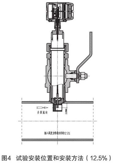 根據中華人民共和國機械行業標準:JB/T9249-2015《壓縮空氣流量計》進行插入式壓縮空氣流量計的研制與設計。在試驗過程中,因為理論研究不充分,再加上經驗不足,采用插入深度是按照以往其它產品(插入式電磁流量計)的經驗,以插入深度為現場管道內徑的 12.5% 進行試驗,其對介質流量的檢測值與同種規格管道法蘭式結構的壓縮空氣流量計進行比較,偏差值較大、儀表準確度無法滿足設計要求。試驗安裝位置和安裝方法如圖 4 所示。