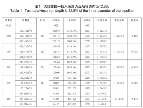 插入式壓縮空氣流量計插入深度為現場管道內徑的 12.5%時,試驗數據如下(以 DN200 為例):