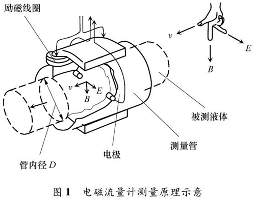 防腐型電磁流量計的測量原理如圖 1 所示。根據法拉*電磁感應定律,導電液體在磁場中流動會產生電動勢 E,它與磁感應強度 B、導電液體平均流速 v 成一定比例關系: