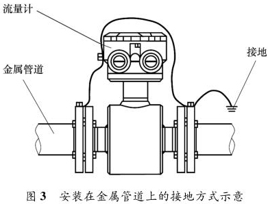 乙醇管道流量計安裝在金屬管道上,安裝時將金屬管道與乙醇管道流量計相連接,接地線再接入接地網,如圖 3 所示。