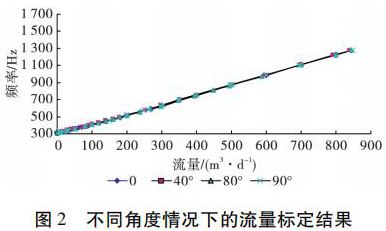 為了考察井眼斜度變化對(duì)硫酸銅流量計(jì)測(cè)量流量的影響,開展了非集流硫酸銅流量計(jì)在不同斜度情況下的流量測(cè)量模擬實(shí)驗(yàn)。模擬實(shí)驗(yàn)在大慶油田多相流實(shí)驗(yàn)室進(jìn)行,儀器外徑 38 mm,模擬井筒內(nèi)徑為 124 mm,實(shí)驗(yàn)介質(zhì)是水,傾斜角度分別為 0°、40°、80°和 90°( 水平) ,流量范圍為 5 ~ 850 m3 /d。實(shí)驗(yàn)結(jié)果表明,在儀器居中條件下,井眼斜度變化對(duì)硫酸銅流量計(jì)的儀表常數(shù)沒有影響,滿量程誤差不大于 4% ,因此可以應(yīng)用硫酸銅流量計(jì)進(jìn)行水平井注水剖面測(cè)量。不同角度情況下的實(shí)驗(yàn)結(jié)果如圖 2 所示。