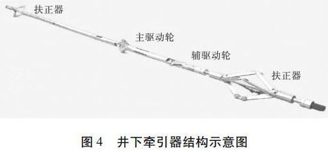 水平井注水井注入剖面測(cè)井工藝原理如圖 3 所示。在垂直井段,儀器在重力作用下可以通過注入管柱下入到井內(nèi),注入管柱下端須裝有喇叭口,且喇叭口應(yīng)在造斜點(diǎn)以上,保證測(cè)井完成后儀器順利起出,不發(fā)生卡儀器問題。儀器通過喇叭口以后在重力作用下繼續(xù)向下移動(dòng),當(dāng)儀器不能靠重力下移時(shí),啟動(dòng)牽引器,利用牽引器將儀器推送到井底,上提電纜過程中進(jìn)行測(cè)井。
