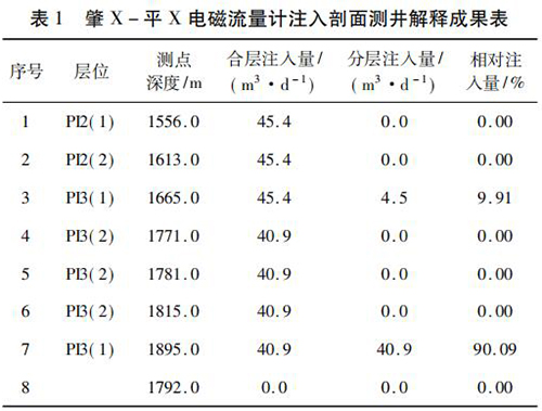 2017 年 9 月在大慶油田采油八廠肇 X - 平 X 水平井注水井中*次進(jìn)行了水平井注入剖面測(cè)井現(xiàn)場(chǎng)試驗(yàn)。該井斜深2 055. 42 m,水平段長(zhǎng)度為568. 46 m,試驗(yàn)?zāi)康氖峭ㄟ^注入剖面測(cè)井了解該井各層段的注水情況,同時(shí)對(duì)水平井測(cè)井工藝、儀器的適用性、井下牽引器及井口輔助裝置等設(shè)備的工作有效性和可靠性進(jìn)行評(píng)價(jià)。現(xiàn)場(chǎng)試驗(yàn)中,在密閉條件下錄取到了該井的注入剖面測(cè)井資料,進(jìn)行了重復(fù)測(cè)量,重復(fù)測(cè)量結(jié)果在誤差允許范圍內(nèi),測(cè)井成果見表 1。該井施工壓力 6. 0 MPa,注入量45. 4 m3 /d,有 7 個(gè)射孔層,分 8 個(gè)測(cè)點(diǎn)測(cè)量,2 個(gè)層有吸入顯示,其中,P13( 1) ( 1 734 ~ 1 767 m) 層絕對(duì)吸入量4. 5 m3 /d,相對(duì)吸入量為9. 91 %,P13( 1) ( 1 899 ~1 943 m)層絕對(duì)吸入量 40. 9 m3 /d,相對(duì)吸入量為 90. 09% ,測(cè)井成果見表 1。通過與甲方的交流,再結(jié)合該井的動(dòng)靜態(tài)資料及周圍井的工作狀況,采油廠的地質(zhì)人員認(rèn)為本次測(cè)井結(jié)果能比較準(zhǔn)確地反映該井的注入情況。