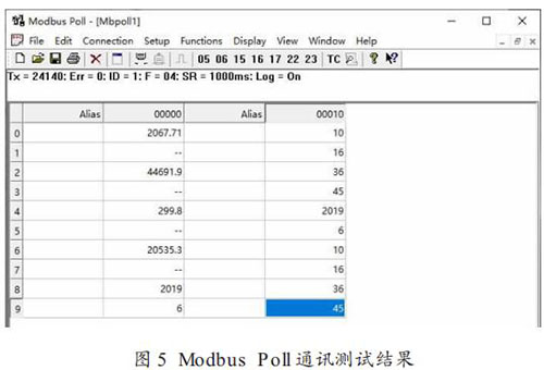 Modbus Poll 通訊測試結果如圖 5 所示:Tx = 24140,Err =0,ID = 1,F = 04,SR = 1000ms,Log = on。 其中 ,Tx 為Modbus Poll 發送命令次數,也就是說在測試期間 Modbus Poll軟件共發送讀輸入寄存器命令 24140 次(發送間隔為 1s,測試時間為 6.7 小時);Err 為通訊錯誤數,Err = 0 表明 Modbus 通訊模塊正確響應次數為 24140 次(錯誤數為 0)。