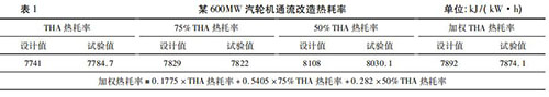隨著火電機組利用小時數(shù)降低,發(fā)電企業(yè)一般都會根據(jù)不同負荷工況下的實際運行小時數(shù),確定機組熱耗率考核權重,形成*終的加權熱耗率考核值。考核加權熱耗率對設備廠家末級葉片選型、高壓調(diào)門與高壓缸匹配性提出了更高的要求,在當前負荷率偏低的情況下增強了發(fā)電企業(yè)的競爭力。然而,僅僅對加權熱耗率進行考核是不夠的,設備廠家為了增強自身的競爭力,往往會把全部重點放在如何降低占比大的低負荷熱耗率上而犧牲高負荷的熱耗率,這無疑削弱了發(fā)電企業(yè)的適應性。某廠一臺 600MW 汽輪機通流改造時僅對加權熱耗率進行考核,THA 熱耗率要高出設計值43. 7 kJ/( kW·h) ,詳見表 1。通流改造時既要對加權熱耗率進行考核,也要對 THA工況時熱耗率進行考核。