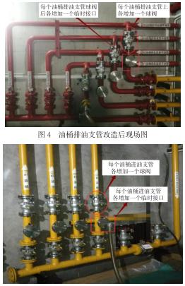 該水電廠在地衣輪機(jī)組檢修結(jié)束后針對上述弊端,結(jié)合透平油處理室油焦?fàn)t煤氣流量計(jì)布置的現(xiàn)狀,利用無機(jī)組檢修工作的汛期期間,對油處理室中油處理焦?fàn)t煤氣流量計(jì)進(jìn)行改造。具體改造內(nèi)容為:將各油桶的進(jìn)油和排油支管球閥后增加設(shè)置相關(guān)的臨時(shí)接口,便于油處理設(shè)備通過活接頭和軟管直接與各個(gè)油桶單好連接,可不受機(jī)組透平油供油、回油總管的臨時(shí)連接口限制。在支管上增設(shè)的臨時(shí)接口后各增加一個(gè)球閥,以便于將油桶中的油路切斷而進(jìn)行臨時(shí)接頭和軟管的連接。具體改造焦?fàn)t煤氣流量計(jì)效果見圖4、圖5所示。