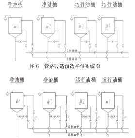 (1)改造后,各個(gè)油桶的油處理工作實(shí)現(xiàn)互不影響的效果。油桶排油支管的臨時(shí)接口兩端的球閥都是近油桶側(cè)的閥門,油桶進(jìn)油支管的臨時(shí)接口ding部的球閥為近油桶側(cè)的閥門。油桶需進(jìn)行油過濾工作時(shí),僅需將濾油機(jī)的進(jìn)油管接在該油桶排油支管新增的臨時(shí)接口上,同時(shí)濾油機(jī)的出油管連接在該油桶進(jìn)油支管新增的臨時(shí)接口上,然后分別打開進(jìn)油支管和排油支管新增臨時(shí)接口ding部的近油桶側(cè)球閥,即可開始形成循環(huán)油路進(jìn)行油桶內(nèi)的透平油過濾。同時(shí)未改變各個(gè)油桶中透平油的互相倒換、轉(zhuǎn)移功能。