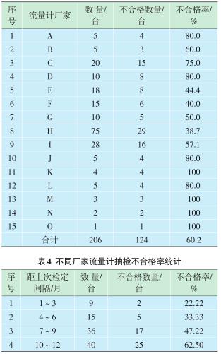 主要分析了油田內(nèi)常用廠家產(chǎn)品的檢定合格率,各廠家流量計檢定合格率對比見表3。從表3中可以看出:氣體流量計周期內(nèi)誤差超差概率偏大,總體達(dá)60%。