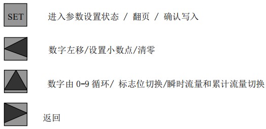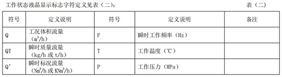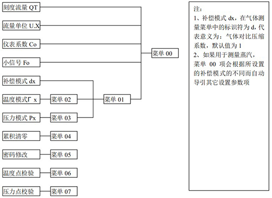(3)標(biāo)況流量計(jì)算公式(若補(bǔ)償后單位為 U.0):(4)標(biāo)況流量計(jì)算公式(若補(bǔ)償后單位為 U.1):注:標(biāo)況指 20℃,1 標(biāo)準(zhǔn)大氣壓三、一體化液晶顯示表頭參數(shù)設(shè)置操作說(shuō)明(V03Z)1、鍵盤按鍵說(shuō)明2、 顯示窗字符說(shuō)明注:表中 x 代表“0”或“1”;Zn:標(biāo)準(zhǔn)狀態(tài)下(20℃,1 標(biāo)準(zhǔn)大氣壓),被測(cè)氣體的壓縮系數(shù),Z:工作狀態(tài)下被測(cè)氣體的壓縮系數(shù)3、 操作說(shuō)明3.1、本儀表表頭采用自導(dǎo)引式和菜單式相結(jié)合的參數(shù)設(shè)置方式,所謂自導(dǎo)引式參數(shù)設(shè)置方式就是用戶在進(jìn)入菜單 00 項(xiàng)后,表頭中的微電腦會(huì)自動(dòng)導(dǎo)引用戶去設(shè)置需要設(shè)置的參數(shù)。另外,用戶也可以通過(guò)菜單模式分別對(duì)各組參數(shù)進(jìn)行設(shè)置。蒸汽測(cè)量菜單框圖如下:3.2、參數(shù)設(shè)置約定:在設(shè)置各項(xiàng)參數(shù)時(shí),提示符閃動(dòng)代表該項(xiàng)參數(shù)沒(méi)有設(shè)置完或者尚未確認(rèn),可以通過(guò)按SET 鍵來(lái)確認(rèn)或者按→鍵退出;提示符不閃動(dòng)代表該項(xiàng)參數(shù)已設(shè)置完并確認(rèn),此時(shí)可以通過(guò)按 SET 鍵翻頁(yè)或者按→鍵退出。進(jìn)入?yún)?shù)設(shè)置時(shí),需要輸入密碼(6 位)并確認(rèn)進(jìn)入,為了防止誤進(jìn)入?yún)?shù)設(shè)置菜單,保證儀表正常工作,在設(shè)置密碼時(shí),使用↑鍵調(diào)數(shù)時(shí)不能循環(huán)調(diào)數(shù),只能單次調(diào)數(shù),只有密碼輸入正確進(jìn)入各項(xiàng)參數(shù)設(shè)置菜單后才可以對(duì)各位循環(huán)連續(xù)調(diào)整數(shù)據(jù)。3.3、儀表參數(shù)設(shè)置舉例:儀表出廠前各項(xiàng)參數(shù)已設(shè)置好,用戶無(wú)需設(shè)置。如果用戶需要設(shè)置某項(xiàng)參數(shù),請(qǐng)參照以下步驟,例如修改刻度流量值 QT:在工作狀態(tài)下,按 SET 鍵,顯示屏顯示 P,數(shù)字位為全零,8 秒鐘若無(wú)操作,自動(dòng)返回工作狀態(tài)。輸入密碼 :按數(shù)字↑鍵和左移←鍵,輸入密碼數(shù) xxxxx(出廠時(shí)默認(rèn)密碼為 000123),↑鍵調(diào)各位數(shù)字 0-9,每按 ←鍵一次數(shù)字向右循環(huán)一位,可通過(guò)多次按←鍵對(duì)整段數(shù)字清零,按→鍵可以返回工作狀態(tài)。菜單選擇項(xiàng):按 SET 鍵確認(rèn),顯示屏顯示如右圖所示,末行“00”閃動(dòng)調(diào)整該項(xiàng)值選擇不同參數(shù)設(shè)置菜單。該例直接按 SET 鍵進(jìn)入菜單 00 項(xiàng)設(shè)置刻度流量:QT 閃動(dòng),*一步:*先進(jìn)行小數(shù)點(diǎn)調(diào)整,可以通過(guò)←鍵對(duì)參數(shù)快速清零或者通過(guò)↑鍵進(jìn)行小數(shù)點(diǎn)調(diào)整,調(diào)整完畢,按 SET 鍵確認(rèn)(QT 仍閃動(dòng));*二步:數(shù)值調(diào)整,可以通過(guò)↑鍵對(duì)每位數(shù)字進(jìn)行調(diào)整,按 ←鍵一次數(shù)字向右移動(dòng)一位,調(diào)整完畢,按 SET 鍵確認(rèn),QT 停止閃動(dòng),該項(xiàng)參數(shù)設(shè)置完畢,可進(jìn)行下一項(xiàng)參數(shù)設(shè)置或者退出另外,單位設(shè)置 U.X 和補(bǔ)償方式設(shè)置 dX 通過(guò)↑鍵調(diào)整修改。3.4、校驗(yàn)項(xiàng)說(shuō)明: 儀表出廠前,溫度和壓力通道已校驗(yàn)設(shè)置好,無(wú)需用戶重新校驗(yàn)。校驗(yàn)通道有密碼保護(hù),廠家不對(duì)外開(kāi)放,如果需要重新校驗(yàn)溫度或者壓力通道,請(qǐng)專業(yè)人員與廠家技術(shù)人員聯(lián)系。4、計(jì)算公式說(shuō)明4.1、蒸汽測(cè)量計(jì)算公式(1)渦街流量?jī)x表工況體積流量計(jì)算公式:(2)密度 d,單位 Kg/m3(3)質(zhì)量流量計(jì)算公式,單位 Kg/h:(4)質(zhì)量流量計(jì)算公式,單位 t/h:4.2、氣體測(cè)量計(jì)算公式----標(biāo)況指 20℃,1 標(biāo)準(zhǔn)大氣壓(1)渦街流量?jī)x表工況體積流量計(jì)算公式:(2)對(duì)比壓縮系數(shù) d(Zn/Z),單位 1(3)標(biāo)況流量計(jì)算公式,單位 Nm3/h:P1—工況絕壓,PN—標(biāo)況絕壓(Mpa),T1—工況熱力學(xué)溫度,TN—標(biāo)況熱力學(xué)溫度(K)