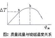 在總的熱傳導系數a中,因測量管壁很薄且具有相對較高熱導率,儀表制成后其值不變,因此a的變化可簡化認為主要是流體邊界層熱導率的變化。當使用于某一特定范圍的流體時,則a、cp均視為常量,則質量流量僅與繞組平均溫度差成正比,如圖2 oa 段所示。 oa段為儀表正常測量范圍,儀表出口處流體不帶走熱量,或者說帶走熱量*微;超過a點流量增大到有部分熱量被帶走而呈現非線性,流量超過b點則大量熱量被帶走。