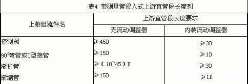 2) 浸入式 帶測(cè)量管的浸入式流量傳感器和插入式儀表需要一定長(zhǎng)度前置直管段,iso/dis 14511對(duì)此未作具體規(guī)定,而按制造廠建議的值。bs 7405建議對(duì)于在管道中用插入熱絲流速計(jì)時(shí),需要(8~10)d的上游直管段和(3~5)d的下游直管段。表4列舉sierra公司對(duì)帶測(cè)量管浸入式tmf所規(guī)定的上直管段長(zhǎng)度;若在其進(jìn)口端裝一塊或二快多孔板式流動(dòng)調(diào)整器(整流器)后,則其長(zhǎng)度可大為縮短,如表*右列所示。