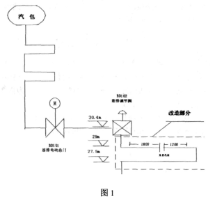 異形孔板安裝在鍋爐30米處連排管段,截去一段加裝U形管段的來流直管段上,根據(jù)安裝要求,測點位置選在距離上游直管段1810mm,距離下游直管段1085mm處。符合“距離上游直管段>10D(D=56mm,管道內(nèi)徑),距離下游直管段>5D”的要求。孔板的取壓管為垂直向下,圓缺孔板的弦與管道橫截面水平中心線平行安裝。其改造安裝圖如圖1所示。