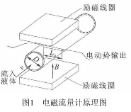 如圖1所示,某一時刻由一對勵某一時刻由一對勵磁線圈產生的磁感磁線圈產生的磁感應強度B,方向向上,流入液體的速上,流入液體的速度為v,管的直徑管為D,兩*的距離為Le,兩*間電動勢,兩*間電動勢ε正比于磁感應強度正比于磁感應強度B、流速v和兩*間的距離Le,即: