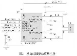 由于探頭尺寸較小,所產生的勵磁電流很弱,由于探頭尺寸較小,所產生的勵磁電流很弱,要處理這樣的信號,則后續(xù)的放大電路要有足夠高要處理這樣的信號,則后續(xù)的放大電路要有足夠高的輸入阻抗和較大的增益,來保證傳感器的靈敏度的輸入阻抗和較大的增益,來保證傳感器的靈敏度及抗干擾性;為了防止交流及抗干擾性;為了防止交流50Hz的工頻干擾,選的工頻干擾,選用方波電流作為勵磁電流,其頻率選用用方波電流作為勵磁電流,其頻率選用12.5Hz,它是1/4的工頻頻率,這樣可有效地抑制工頻干擾。勵磁信號在單片機內部生成,從*勵磁信號在單片機內部生成,從*26腳輸出12.5Hz方波信號,接到勵磁線圈的驅動模塊電路方波信號,接到勵磁線圈的驅動模塊電路IC5(LMD18200T LMD18200T)的3腳信號,它的內部采用腳信號,它的內部采用H橋式驅動,送出勵磁電流加到其橋式驅動,送出勵磁電流加到其2腳和10腳之間的勵磁線圈上。在勵磁線圈L上形成20~30mA方波電流,它與控制方波電壓同步。使流體運動切割波電流,它與控制方波電壓同步。使流體運動切割磁力線產生的方波電壓與勵磁電流完全保持同步, 磁力線產生的方波電壓與勵磁電流完全保持同步,這樣也便于在接收放大電路中信號的同步解調。電路如圖3所示。